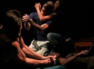 Etrange polyphonie de corps respirants qui se révèlent, entre scansions, chuchotements, éclats de cris, perles de chant. Avec Des ailleurs sans lieux, Sine Qua Non Art explore la figure emblématique du trio à partir d’un point chorégraphique et dramaturgique central : le souffle et ses capacités rythmiques et vibratoires. La partition dansée est la même pour chacun des interprètes. Une danse à l’unisson qui porte en elle le décalage propre au vivant, et aménage l’espace imaginaire nécessaire au spectateur pour investir l’expérience physique, sensorielle et émotive qui lui est proposée. L’écriture chorégraphique est minimaliste : l’architecture des corps, les modes de résonances physiques du souffle dans les corps sont le seul alphabet de ce processus de création chorégraphique. Le geste artistique part ici des espaces intérieurs pour explorer les capacités sonores et rythmiques de la respiration du danseur. Chorégraphier la sensation pour laisser advenir une danse témoin des processus organiques empruntés par le souffle. L’air dans les corps emprunte des trajets multiples, situés dans des espaces, des ailleurs difficilement localisables, mais surgissant pourtant dans la réalité de l’ici et maintenant de la représentation. Les cordes vocales des trois danseurs font écho aux cordes d’un violoncelle invité à cet oratorio vibratoire : ensemble ils établissent leurs propres codes, entrent en dialogue. Surgit alors un paysage humain vif, tranchant, tendre, respirant sa révolte, sa jouissance, sa relation à l’autre. L’usage du souffle est poussé à ses extrêmes. L’ironie espiègle des danseurs vient soudain révéler la tragi-comédie à l’oeuvre : ça rit comme ça respire. Ca rit donc ça respire ? Légèreté grave du souffle, gravité légère du rire, cette danse se joue des codes chorégraphiques, les interpelle pour mieux s’en approprier l’héritage. Et pourtant, étrange expérience de l’altérité, du partage de l’intimité physiologique des interprètes, quand cette évocation de l’humanité respirante vient brusquement nous rappeler le souvenir de notre propre respiration. Et de l’usage que l’on en fait : on vit comme on respire.