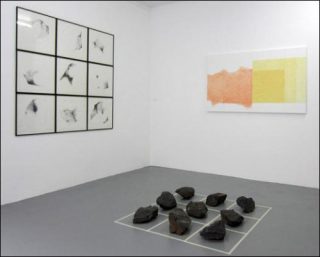 Parfois le dessin soigneusement tracé à la règle puis épaissi à main levée ne suffit pas à contenir la couleur, qui telle la lave ou la pensée libre, connaîtra le débordement. Une sculpture constituée de 9 blocs de pierre brute — tuf noir de Fontaine Froide —, intitulée La preuve par neuf (1991) est présentée sur un damier au sol et semble inviter le spectateur à un jeu dont les règles restent à inventer.