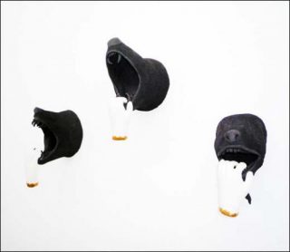 Sur des toiles de canevas, l’artiste brode des femmes endormies. Le sommeil se confond avec la mort. Elle travaille ainsi les notions de passages et de rituels auxquels les enfants sont confrontés de manière consciente ou inconsciente. L’humain et l’animal cohabitent de manière fragmentaire. La tête d’un garçonnet regarde le corps d’un oiseau mort. Des petites mains en céramique blanche sont introduites dans les gueules d’un loup, d’un ours, d’un cheval ou d’un cerf. A la lisière de deux mondes, elle fait dialoguer le danger et la bienveillance.