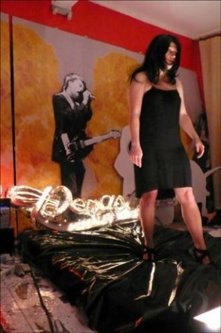 La performeuse Coraline Lamaison évolue dans l’installation qui sert à son trip. Des images ré-appropriées, grossies, des drames en carton et scotch. Elle expérimente le grand désastre pour éprouver, supporter le sien. L’intime désastre.