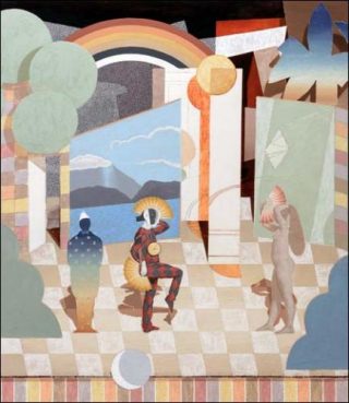 A l’étage est présentée cette toile centrale de l’exposition titrée Trobairitz, dont le personnage principal, entre les troubadours de la peinture italienne et les Arlequins de Picasso, incarne à lui seul une multiplicité historique, stylistique et représentative. L’ensemble du tableau est un agrégat d’éléments disparates liés par une logique mentale et mémorielle. S’inspirant de l’Ars memoriae, moyen mnémotechnique qui consiste à associer au souvenir d’un lieu des éléments que l’on cherche à mémoriser, le tableau de Christian Hidaka est doté de la même utilité dans le cadre de sa propre construction imaginaire. Trobairitz associe aussi bien des références picturales à la Renaissance italienne qu’à Henri Matisse, Pablo Picasso ou Fernand Léger disposées autour du personnage central.