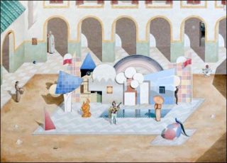 Au rez-de-chaussée, ce même tableau est entièrement désassemblé et déployé en trois dimensions. Tous les éléments de Trobairitz se retrouvent projetés dans tout l’espace d’une grande salle, en une profusion de peintures, à laquelle manque cependant une composante essentielle de l’œuvre initiale: son personnage central. Ainsi se dévoile le sens du titre de l’exposition, la scène vide («Desert Stage») est cet espace semblable à une scène de théâtre où l’action est suspendue en l’absence du héros de la pièce. Cette place provisoirement vide, c’est le visiteur qui peut alors l’occuper en se glissant dans la composition picturale qui devient fiction.