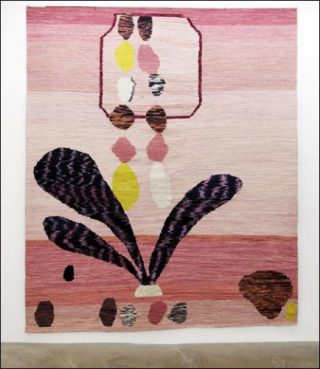 La grana cochinilla est un parasite du nopal donnant une couleur variant du violet foncé au rose pâle utilisée dans l’art textile de la région de Oaxaca. L’artiste a combiné cette palette à celle de colorants chimiques pour teindre des morceaux de serpillières locales (trapeadores) utilisées comme autant de touches colorées pour réaliser des compositions monumentales d’inspiration multiculturelle.