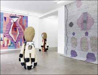 A ces tapisseries s’ajoutent des sculptures s’accaparant elles aussi les forces plastiques architecturales séculaires du torchis, mélange de paille, de boue et d’eau composant cette fois ci de petites structures anthropomorphiques où des masques traditionnels mexicains jouxtent objets locaux de grande consommation simplement choisis pour leur propriétés graphiques dans une sorte de carnaval joyeux et uncanny. Le tout restitue la somme d’expériences plastiques situées ancrant le travail tout autant dans l’espace de la galerie que dans la somme d’images aplanies par le monde des références internet.