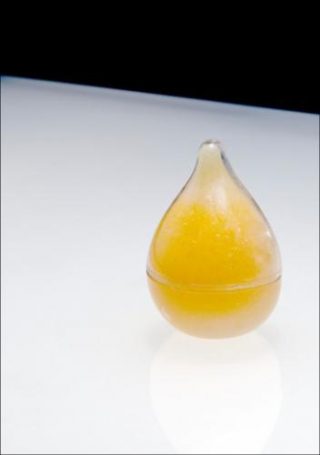 Fragile, ce contenant est protégé par une capsule de polymère biodégradable au contact de l’eau, notamment utilisé pour les sutures médicales. Ainsi le polymère protège la membrane d’alginate de l’extérieur, et l’alginate protège le polymère du contact de l’eau. Le résultat: une fiole s’ouvrant en deux parties, en forme de goutte ou de poire, qui renferme la membrane contenant l’eau. On peut choisir de croquer l’alginate et d’ingérer en même temps le liquide ou seulement de percer la membrane pour n’en boire que le contenu.