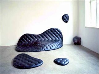 — Pools & Pouf!, 2004. Ensemble de 5 objets « pour s’asseoir », cuir capitonné, PVC, contreplaqué. Élément 1 : 98 x 245 x 90 cm. Élément 2 : 72x108x10 cm. Élément 3 et 4 : 37 x 48 x 10 cm. Élément 5 : 40 x 33 x 33 cm.