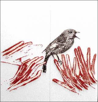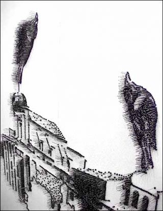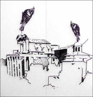 Dans sa nouvelle série de tableaux sur polystyrène, les épingles restent à la surface du support et s’agglutinent le long des traits du dessin. Surplombant les perles, ce sont les aiguilles, visibles sur toute leur longueur, qui se présentent à l’œil comme une multitude de petits traits discontinus. Elles introduisent un relief menaçant sur les paysages de ville et font transparaître la douleur et l’angoisse dans des compositions comme SOS ou Le Chant de l’ange.