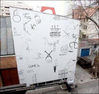 Dan Perjovschi réalise quotidiennement des dessins qui s’apparentent à des dessins de presse, teintés d’un humour parfois grinçant. Chroniqueur attentif de la société contemporaine, il s’intéresse à son environnement immédiat et à l’actualité, tant locale qu’internationale, avec une prédilection pour des sujets politiques et sociaux. Il construit ses ensembles de dessins en consultant de nombreux médias, mais également en observant ce qui se passe autour de lui.