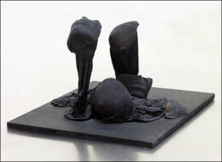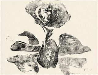Les monotypes d’Alina Szapocznikow sont des empreintes de sombres pensées, à l’instar des tests de Rorschach, et ont des formes puissamment évocatrices. Une silhouette — humaine? — et son ombre transpersent la pénombre…à moins que ce ne soit une chauve-souris rattrapée par l’obscurité. Et là , est-ce une rose? Un visage? L’on s’attend presque à assister à un miracle tel celui du Saint Suaire…