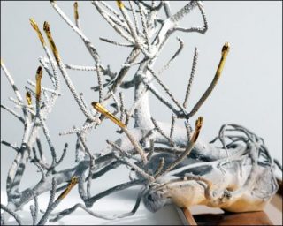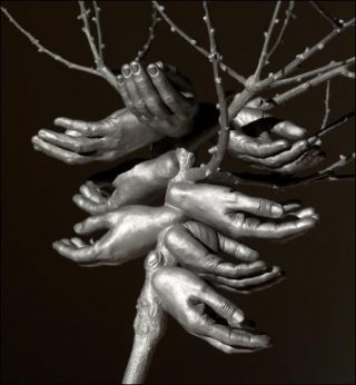 À l’instar de Bernin dans son Apollon et Daphné, Rona Pondick noue une relation intime entre l’homme et l’arbre, suggérant des sensations corporelles et des états psychologiques dont la mythologie ancienne s’était emparée. Dans son Ginko en acier, le faisceau de mains aux paumes tournées vers le ciel exprime une attente et un désir qui semblent émaner des branches de l’arbre. Head in Tree unit étroitement les racines «ombilicales», le tronc-épine dorsale, les branches et la tête profondément concentrée. Head in Tree, Ginko et Dwarfed Pine, trois sculptures coulées dans le métal, passent de l’humain au végétal de manière si imperceptible qu’on les croirait façonnées par la nature.