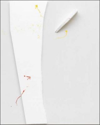 Les jets de pigments procèdent du même geste, convoquant les sensations de détonation, d’énergie et de fulgurance. Des nuées vivantes, rendant presque un son poudreux et effervescent, se sont formées à la surface. L’action de la peinture s’impose au blanc et à la puissance de son éclat lisse. Le travail sur la matérialité élémentaire de la peinture réussit des opérations chimiques qui dégagent des qualités esthétiques et picturales paradoxales, convoquant la sensation d’une composition instinctive, souvent minimale.