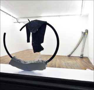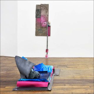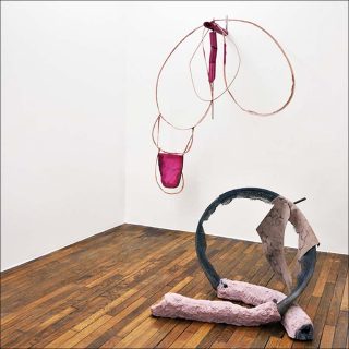 L’œuvre intitulée Epluche, Enfile fait pendre au mur un assemblage d’armature de tente en métal recouverte de tissu rose, d’un fragment de céramique et de tronçons de mousse polyuréthane peints en rose. Dans celle intitulée BELEK, des tiges métalliques plantées dans un bloc de bois portent à leur extrémité des bouteilles enfilées et des fragments de lattes de store en aluminium. Le bois du socle comme les bouteilles sont recouverts de goudron, plongeant l’ensemble dans une teinte noire qu’éclaircit à peine un peu de peinture bleue.