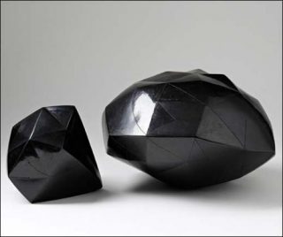 «La géométrie des objets que je modèle a pour origine la sphère, les «solides parfaits»: tétraèdre, hexaèdre, octaèdre, dodécaèdre, icosaèdre, polyèdres étoilés, arrangements cristallins. Mon travail est une déclinaison intuitive, à l’infini de cette géométrie qui engendre des volumes construits selon un «principe mobile»: sans base ni sens, ils sont posés sur un point d’équilibre portant en eux leur centre et leur mouvement. Chaque objet est unique. L’ensemble forme une unité. Polis, gravés, perforés pour y inscrire une cartographie céleste imaginaire. Ils sont «la synthèse des images de la terre profonde et les images du ciel étoilé», pour citer Gaston Bachelard dans La terre et les rêveries de la volonté. Enfumés, ils sont d’un noir brillant à la fois capteur et émetteur de lumière.»
