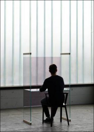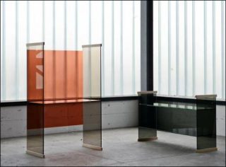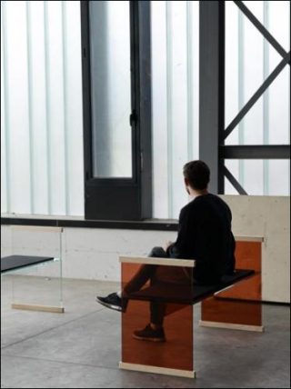 Collection composé d’un banc, un canapé, des petits bureaux et une petite bibliothèque en cristal extralight stratifié et thermo soudé, avec des éléments en frêne massif naturel fixés aux extrémités des côtés portants.