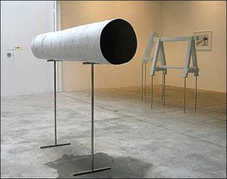 En somme, une nature cannibalisée, emballée par la doxa esthétique imposée par l’homme. La méthode vient en effet très vite s’emparer du sentimentalisme inspiré par la nature: le rondin est posé sur un socle d’exposition, le citron est engoncé dans une machine au réseau de tiges complexe, les tréteaux sont eux-mêmes posés sur des béquilles métalliques, la terre labourée est contrainte dans un cadre muséal. Il s’agit d’une nature en démonstration (comme pouvaient l’être ses maquettes de ruines industrielles), ou pour mieux dire, d’une nature naturalisée.