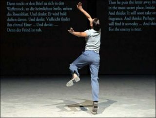 Cette fois, elle va à la rencontre du poème en prose Le chant de l’amour et de la mort du cornette Christoph Rilke que Rainer Maria Rilke écrivit à l’âge de 23 ans. Il ne s’agit pas pour elle d’élaborer à partir de Rilke une pantomime actuelle, encore moins d’illustrer le texte ou de le traduire scéniquement mais de trouver des chemins de traverse.