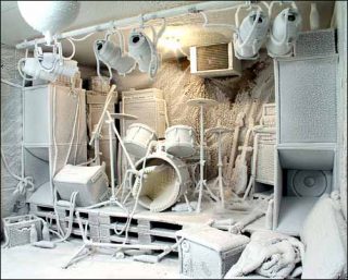 Christoph Büchel, Minus, 2002. Installation réactivée en 2005 avec les groupes Los Chicros et I love UFO, chambre froide, matériel pour concert, lumières. 280 x 540 x 400 cm.