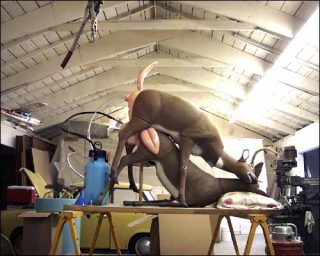— Cockjuice Joe, 2004. Sculpture Peluche, tissu, échafaudage, ampoule. 450 x 280 x 280 cm.