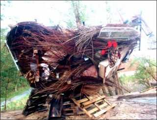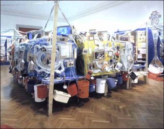 Martin Kersels, Dionysian Stage, 2005. Sculpture monumentale avec bois, meubles, moteurs, matériaux de récupération produite par le Centre Pompidou. Env. 300 x 400 cm.