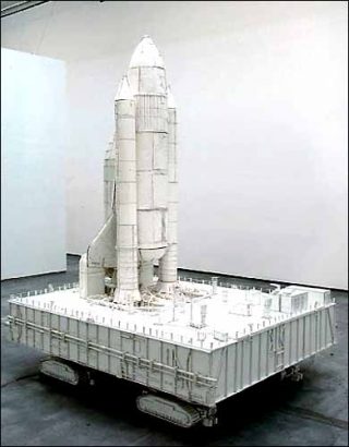 — The Crawler, 2003. Carton, colle, bois et métal. Base : 114,30 x 200,70 x 171,50 cm; navette : 185,40 x 61 x 101,60 cm.
