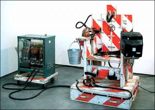 Face à cet ensemble, une barricade de police — Police do not cross ! — rapportée à l’échelle 1/4, et posée sur un socle, dénonce la paranoïa sécuritaire américaine. Tandis que sont gravées sur une arme bricolée les initiales de JFK, avec ses dates de naissance et de mort 1917-1963. Récemment, Bowling for Columbine de Mickaël Moore a mis en lumière la décadence d’une civilisation trop riche.