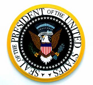 — Presidential Seal, 2003. Peinture sur bois, colle, métal. Ø 153 cm.