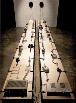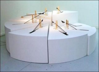 Entrer dans l’exposition relève d’un tel parcours, une étrange expérience où le cours du temps est suspendu. Les œuvres en volumes parlent toutes de cela. Bernard Rüdiger, Le Gentil Garçon, Frédéric Lecomte, Rémi Boinot, Magali Sanheira, Bernard Calet et Dominique Blais jouent sur un enfermement temporaire qui dure trop longtemps, une obsession lancinante, une effraction soudainement arrêtée… Ils parlent d’équilibres précaires, d’instantanés du cours des choses et des existences. Aux murs, les œuvres de Jérôme Poret, Antoine Deschamps, Frédéric Morin, Diego Movilla et Franck Charlet travaillent aussi cette question de l’équilibre en illustrant le passage de l’anonymat à la lumière et inversement en plongeant le glorieux au cœur des ténèbres.