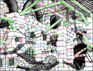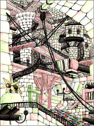 Après avoir montré il y a deux ans un film d’animation, Tootown année zéro (2000), où une ville se dévoile sous nos yeux comme un road movie, elle présente plusieurs dessins inspirés des fameuses prisons de Piranèse, sorte d’utopies concentrationnaires et fantasmatiques. Refaits à l’identique, ils sont pourtant revisités par une vision actuelle toute écranique. Laure Tixier travaille comme on reprend son motif, mais ce dernier est plus proche d’une console de jeu électronique que d’un métier à tisser. Elle construit des figures et des paysages comme on joue à Tétris, un autre jeu culte minimaliste d’assemblage de briques tombant du haut de l’écran en emboîtant et combinant des motifs colorés.