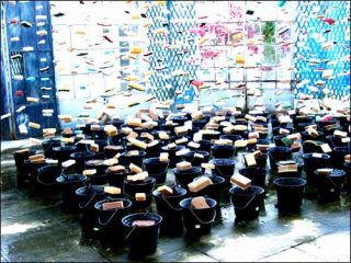 — Végétale et naturelle, 2002. Eponges, systèmes d’arrosage automatique sur câbles d’acier, seaux en plastiques. Dimensions variables.