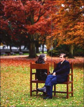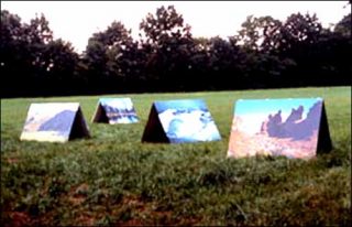 Delphine Coindet a choisi d’installer ses Campements dans le parc en sous bois et sans ménagement. Six panneaux doubles et articulés, disposés au sol façon «canadiennes», servent de support à de belles photographies paysagères. Les grands stéréotypes du paysage mondial y sont représentés sauf peut-être le parc paysagé à l’anglaise qui sert de cadre environnemental à l’installation (à l’origine sans doute était-il «à la française» si l’on en juge par les grandes allées percées). S’opère alors insidieusement une contagion de l’image au réel amenant le promeneur à s’interroger peut-être sur la nature elle-même stéréotypée et artificielle du charme opéré sur lui par ce somptueux décor «naturel».