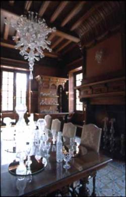 L’installation Sans titre de Richard Fauguet transforme la salle à manger Boucicault du château en un véritable cabinet de curiosités. Sous des vitrines à l’instar d’objets rares et précieux, fixé au plafond telle une suspension baroque digne d’un palais vénitien, se substituant ironiquement au trophée de chasse fixé au manteau d’une cheminée ou disposé sur une table, son travail envahit l’espace de la pièce tout en transgressant ses diverses fonctions domestiques. Assemblage de carafes de cantine, de bols en pyrex, de verres à pied et autres ustensiles de vaisselle en verre blanc, ses objets sculptés parfois recouverts «d’épines» de silicones seraient dignes d’un Bernard Palissy reconverti en artisan verrier. Mais installée de la sorte, cette prolifique production à la fois délirante et précieuse devient, dans ce lieu singulier, l’étonnante collection d’un amateur fou autant qu’averti.