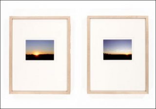 Une autre pièce, présentée dans un espace reclus de la galerie, est une émanation de ce processus. Deux caissons lumineux renfermant des images de levé et couché de soleil prises à Nida (Lituanie) s’illuminent une minute par jour, à l’heure précise correspondant à leurs prises de vue respectives.