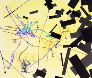 Sans doute sont-ce les couleurs employées (noir et blanc, rouge et blanc) qui font venir à l’esprit le suprématisme de Malévitch; il peut s’agir aussi de l’éclipse ici opérée qui rejoue celle, dans le Quadrangle noir, du monde objectif escamoté derrière le carré noir du sans objet. Mais par un subtil renversement, c’est le masquage lui-même qui fait apparaître l’idée d’une figure qui n’est pas sans évoquer celles, très mécanisées, d’un El Lissitzky, c’est le bandeau de l’anonymat qui apporte une manière de détermination à la structure informe des taches qui, elle, rappelle bien davantage l’univers de Miró. Là est la tension jubilatoire qui anime ces tableaux: dans le surgissement d’un ordre géométrique dans l’apparent aléatoire des taches, dans ces formes rectilignes qui structurent un dynamisme qui toujours les déborde.