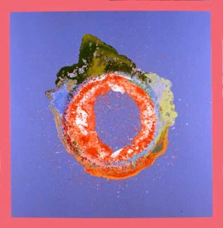 Les grands formats presque carrés de cette nouvelle série sont tous encadrés d’un large bandeau peint sur la toile dans une couleur qui marque un fort contraste avec le fond. Le fond est recouvert d’une couleur parfaitement unie. L’encadrement et le fond apparaissent comme un écrin, une arène pour ce qui vient ensuite se loger au centre du tableau. En plein cœur de la composition est peint un motif complexe qui s’apparente tantôt à un anneau, tantôt à une sphère. Ce motif est obtenu semble-t-il par un dépôt calculé de couleurs qui s’interpénètrent entre elles, irradiant la surface de la toile de tous les côtés.
