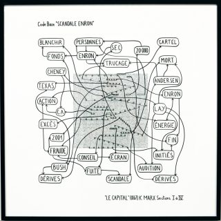 Les dessins, textes et peintures d’Öyvind Fahlström prennent tous la forme de schémas. Le grand intérêt de l’artiste suédois pour la géographie se traduit par la réalisation de cartes qui sont autant de mises en espace et de fixations de connexions humaines, de situations géopolitiques, de vision du monde. Les séries World Map et Column illustrent ainsi les rapports de pouvoir qui structurent les relations mondiales et en particulier la domination des Etats-Unis. Cette interprétation critique des réseaux de pouvoir est également au cœur des dessins de Mark Lombardi, d’Ahsley Hunt et de Julien Prévieux.