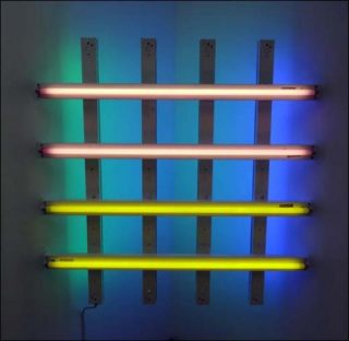 — Dan Flavin, untitled (in Honor of Harold Joachim) 2, 1977. Tubes fluorescents: rose, jaune, bleu et vert. 122 x 122 cm.