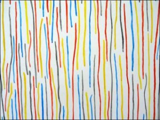 — Sol LeWitt, Wall Drawing 768 (détail). Gray, yellow, red and blue not straight vertical brushstrokes, not touching. Lavis d’encre de Chine et d’encre colorée. Dimensions variables.