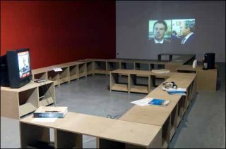 Ainsi, Johan Grimonprez présente la vidéo en cours de réalisation Double Take. Ajustée à la vocation expérimentale du lieu, Double Take demande au spectateur via des post-it jaunes collés sur le lecteur DVD, d’appuyer sur «Play». Activons l’œuvre.