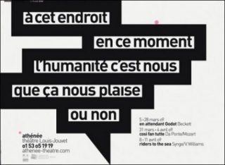Pour l’Athénée, des lettrages du noir au gris sur fond blanc, soulignés ou surlignés en négatif. Seul motif récurrent, un point rose fushia comme un signalement, qui lui a valu le slogan du « théâtre qui a un grain… de beauté ». Contraste et sobriété pour que se manifestent des intitulés en forme de déclamations ordinaires: « A chaque fois on s’embrasse et puis y’a rien de fait ».