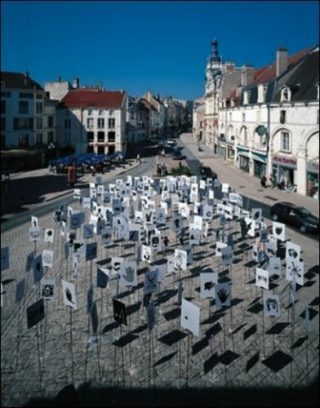 En 2002 à Chaumont, « le théâtre des questions » prend la forme d’un spectacle volatile, affranchi de la relation frontale aux murs du Festival. Agrafmobile y avait déjà travaillé la densité urbaine: pour « takalefaire », une forêt de pictogrammes des engagements des habitants faisait face à une terrasse de café, haut lieu du débat public planté de parasols.