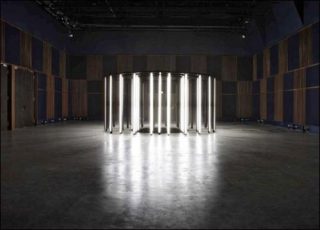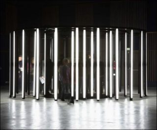 Cette installation de Berger&Berger a été conçue avant tout comme un espace de circulation. Une sorte d’architecture poreuse, composée de trois cercles concentriques de taille croissante supportant chacun une rangée de tubes fluorescents.