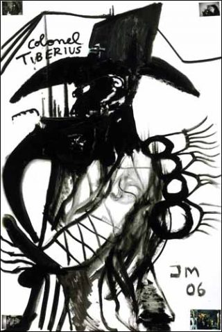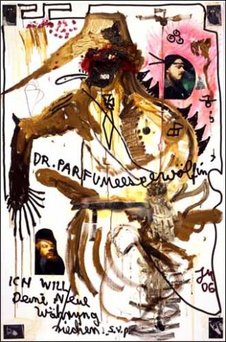 — Dr. No (Meesaint Just II Mein Ich, die Warheit) , 2006. Bronze. 182 x 76 x 60 cm. — Vorspeise «Struppi» im Politikum des Vorstrahls, 2006. Huile et technique mixte sur toile. 210 x 140,5 cm.