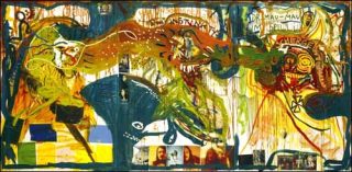 — Der Populärgott «Ammeese», 2006. Huile et technique mixte sur toile, triptyque. 210 x 421 cm.