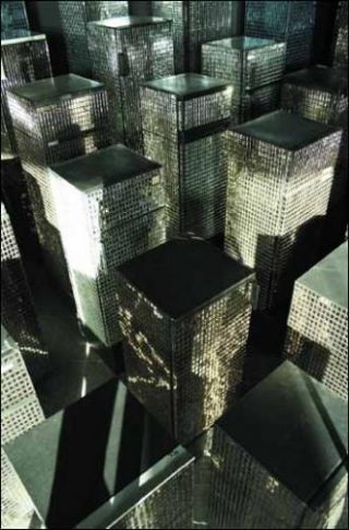 — Kader Attia, Untitled (Skyline), 2007. Installation (19 réfrigérateurs, peinture, tessels de miroirs)
