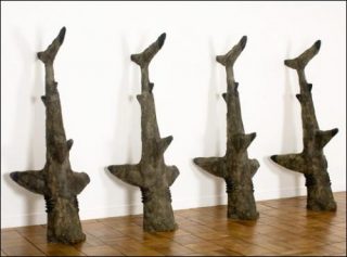 D’autres artistes se servent de la figure de l’animal pour créer des représentations aux allures symboliques ou burlesques. C’est notamment le cas dans World Eaters. Conquest, Famine, Death, War de Damien Deroubaix, qui présente une série de quatre requins posés à la verticale, le nez écrasé contre le sol. La figure de l’animal est ici mise à mal car, elle va à l’encontre de son image de prédateur cruel véhiculée par le cinéma ou la bande dessinée.