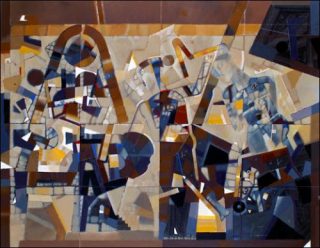 Son but est de parvenir, à l’aide de ces atomes géométriques, à élaborer un espace-temps équivoque-plurivoque, par décalages et décrochements de plans et d’aires colorées. Le monde éclaté, disséminé en mille tessons rigoureusement positionnés et peints, où se trouve piégé un fantoche humain, élément parmi les éléments, pantin qui se débat, court, gesticule ou se met en posture de crucifié, ce monde fout le camp, sombre corps et biens dans le néant. Déroute d’un cosmos anomique et pour ainsi dire anticosmique, que l’anarchie déstabilisatrice sciemment, savamment, brillamment organisée par son auteur, condamne à la disparition. Ce coulage, cette fuite ne sont rien d’autre que la coulée du temps, chaque moment, chaque image, chaque pensée tombant hors du cadre de la conscience.