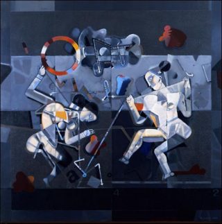 Dans les gravures comme dans les peintures d’Assadour, les figures humaines et les figures géométriques de base ont toujours été intégrées à l’esquisse d’un paysage urbain, avec des constructions architecturales qui essaient de mettre de l’ordre dans le chaos du monde tel qu’il l’a vécu à Beyrouth, et tel qu’il le voit depuis toujours. Au cours des dernières années, il a amorcé un changement important dans sa pratique picturale. La couleur dominante a changé, le gris bleu et noir remplace désormais l’orange ou se marie aux multiples nuances des autres couleurs, crée des compositions aux multiples surfaces contrastées, avec une mise en lumière parfaite et maîtrisée. Le principal changement est dans la structuration même de l’espace: les grandes figures humaines occupent désormais la place centrale de l’espace pictural et ont remplacé les grandes formes architecturales qui organisaient l’espace urbain chaotique, et les multiples figurines anonymes que l’artiste dispersait dans l’espace de ses Å“uvres ont pratiquement disparu.»