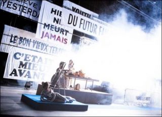 Où se réfugier sinon, dans l’éternité… Depuis qu’il est en résidence à Rome, à la Villa Médicis, Théo Mercier connaît l’angoisse de vivre entouré de vieilles pierres. Il la manifeste en peignant à la main des slogans de protestation sur d’immenses banderoles de coton. «Hier ne meurt jamais»; «Le bon vieux temps»; «Je ne regrette rien»…: ces banderoles servent de décor à cette tragique comédie musicale dans laquelle l’artiste a embarqué performeurs, acteurs, danseurs, chanteuse… tous ralliés à son impératif implacable: «Du futur faisons table rase». Ou pour le dire autrement, ne soyons pas nostalgiques de demain.
