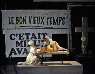 Ce soir l’avenir est à vendre. Pourtant quoi de plus imparfait que le présent? Le passé peut-être, avec ses oripeaux poussiéreux. Effets sonores et optiques, rythme heurté, jeux d’ombres et d’éclairages, apparitions, déclamation, tout se joue sur scènes. Le pluriel est important. Podium, tribune, tréteaux de théâtre, plateau de festival, piédestal: c’est là que le temps se matérialise, à la vitesse de la lumière. Il y a un sens de lecture, qu’il faut essayer de suivre. Chronologique absurde.