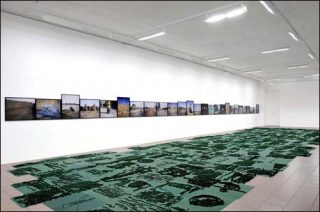 A l’étage sont installées quelques photographies issues de la série 101 photographies et les Skizzes qui leur sont relatifs — le terme proche de «schizophrénie» n’est pas anodin. Chaque photographie montre une sculpture improvisée, un ready-made local, fait de cocottes empilées, de pneus amoncelés, ou fixant un paysage, un bâtiment, ou l’intérieur d’un restaurant, etc. L’image surplombe son Skizze, relief en silicone vert réalisé d’après le détourage plutôt grossier des motifs de la photographie. Chaque photographie a donc son pendant négatif, son oxymore. En même temps que le Skizze dédouble l’image, il se distingue radicalement de l’originale. Il faut d’ailleurs un certain temps pour comprendre qu’il s’agit d’un même motif. Aussi, on constate qu’aucune photographie n’affiche de lignes directrices franches, qui permettraient réellement le mimétisme. Le détourage net s’en trouve donc largement compromis. Le double, chez François Daireaux, n’est jamais copie conforme. Il n’est pas l’envers mais plutôt l’endroit contrarié ou augmenté, et surtout, il est pluriel et infini.